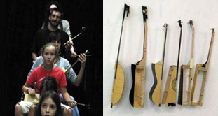 a guitar has six strings. from this guitar, I made six guitars with each one only one string. each musician hold one of these self-made guitars and play his note by watching a circular rotating partition. we play "The star-spangled banner".